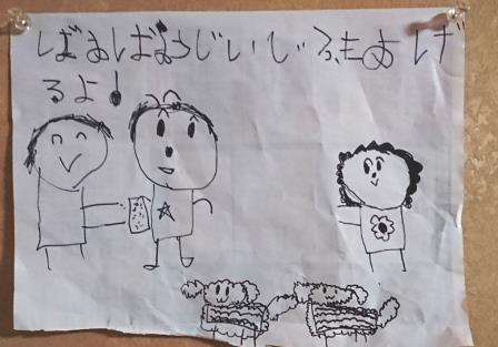 似顔絵と一緒に「ばあば、じいじクッキーあげるよ」って書いてある。