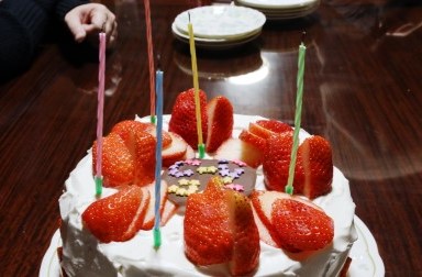 今日は私67歳、「ふく」7歳の誕生日。ケーキを買って貰って二人と2匹でお祝いした。