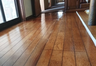 次はリビングのフローリングが待っている。窓際の色が剥がれている。