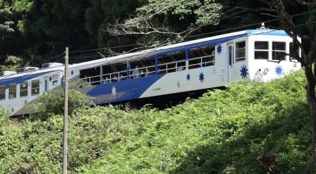 舞茸センターに行く途中踏切の遮断機が下りていたのでもしやと思いセンターでカメラを持って待っていたらトロッコ列車がやって来た。