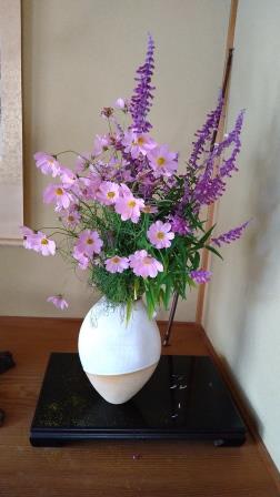 画像は今月の生け花。真ん中のえんじ色がトルコ桔梗だそうだ。