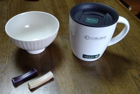 「圭輔」は保温ができるマグカップ、「あかり」はご飯茶碗と箸置き。